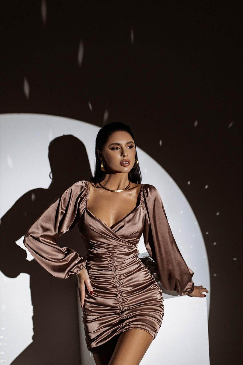 | Тип призначення | Вечірнє коричневе розкішне плаття міні з драпіруванням і пишними рукавами |
