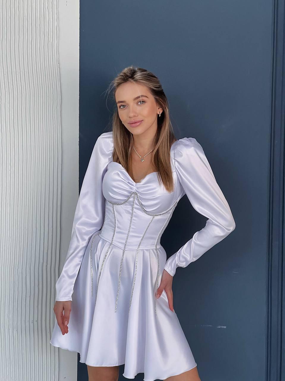 Вечірня біла атласна коротка сукня з корсетом